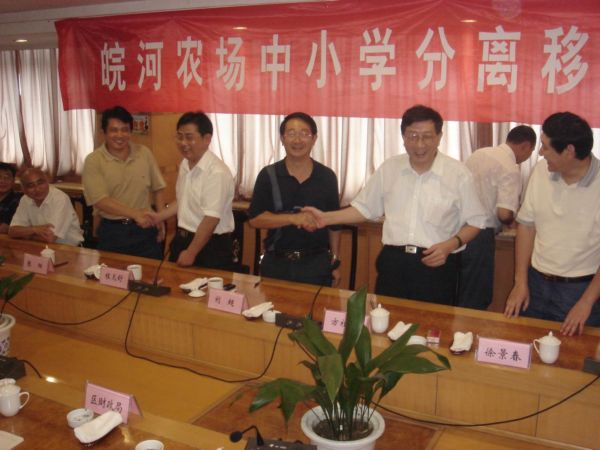 由于人员多、规模大等诸多原因,皖河农场中小学分离移交工作一度迟缓。场党委针对农场教育分离移交的实际,将移交工作作为“一号工程”来抓,并制定了一系列的措施和预案,保证了教育移交和正常教学两不误。场长张阳就任后,亲自过问移交工作,副书记邵乃昌具体抓、负实责,多方奔波、协调,加强和市、区政府、部门的联络和对接,做了大量艰苦有效的工作。省国资委的领导对皖河的教育移交倾注了大量的心血,给予了倾力支持。集团公司刘超副总经理数次带队冒严寒、顶酷暑,奔赴安庆及大观区,一方面现场办公,解决实际问题,安抚移交人员;另一方面协调、对接、商谈,及时调整移交方案,最终为移交打开“绿色通道”。在这个过程中,集团公司社区处的领导对移交工作给予了具体的指导。