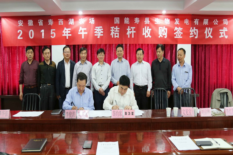 为贯彻落实省政府关于加快发展农作物秸秆发电的意见,427日下午,安徽农垦寿西湖农场与国能电力集团旗下寿县生物发电有限公司举行2015年秸秆收购签约式,联手推进5.6万亩农作物秸秆禁烧,添力秸秆能源化利用和资源节约、环境保护。
