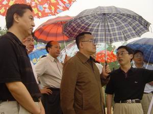 6月18日下5时许,省长王金山在滁州市、天长市等 领导同志的陪同下,冒雨来到高邮湖大堤大圹圩段 检查指导防汛准备工作。 王省长在大堤上听取了地 方政府部门有关领导关于防汛准备及高邮湖大堤应 急加固情况的汇报。大圹圩农场场长徐成银前往大 堤迎接王省长一行。+ (邝正 轩)