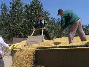 连日来,潘村湖农场抓住当前晴好天气,组织人力 和机械全面打响秋收战役,到9月27日,已收获大 豆2.6万亩,完成任务的81%。由于管理措施到位 加之天公作美,今年该场3.2万亩夏大豆喜获丰 收,从已收获的情况看,亩产达到200公斤的地 块占到1/3,预计全场平均单产在190公斤左 右,创建场50年来最高纪录。图为家庭农场职工 新收获的大豆登场的情景。(杨登宏)