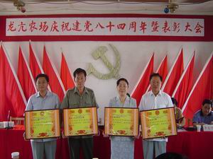 日前,龙亢农场党委评选表彰4个先进党组织,4名优 秀党务工作者和30名优秀共产党员。图为先进党组 织代表在领奖。(龙亢农场党群部 王戴群)